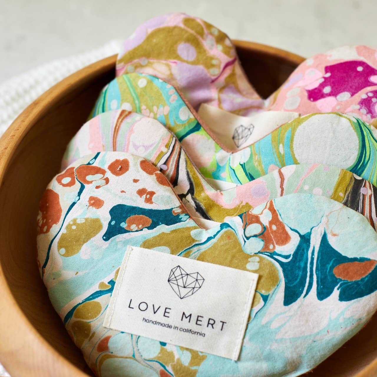 Each pillow is crafted from hand-marbled organic cotton with a soft raw silk backing and filled with organic flaxseed and lavender. Gently weighted, it hugs the face perfectly for deep relaxation.