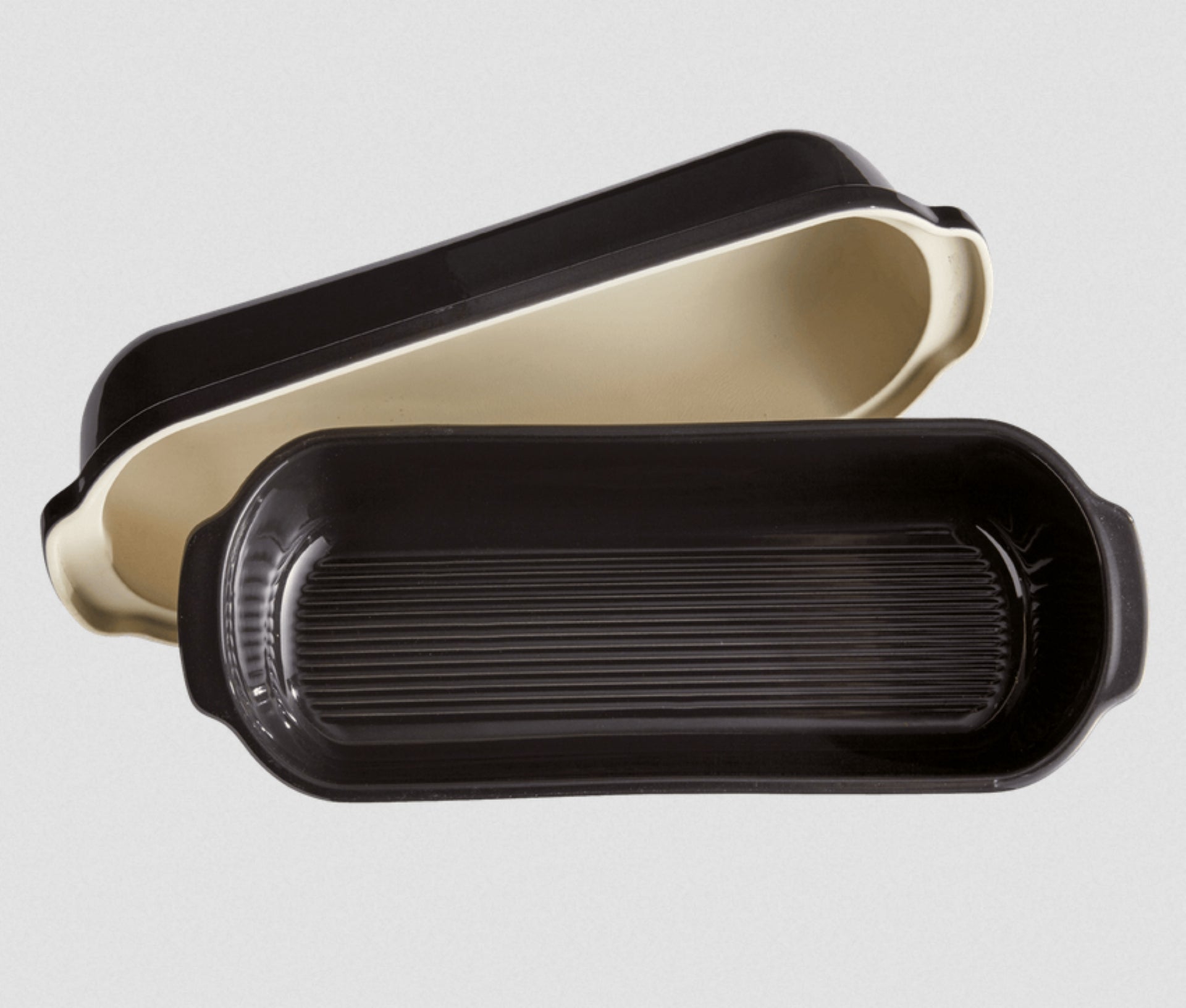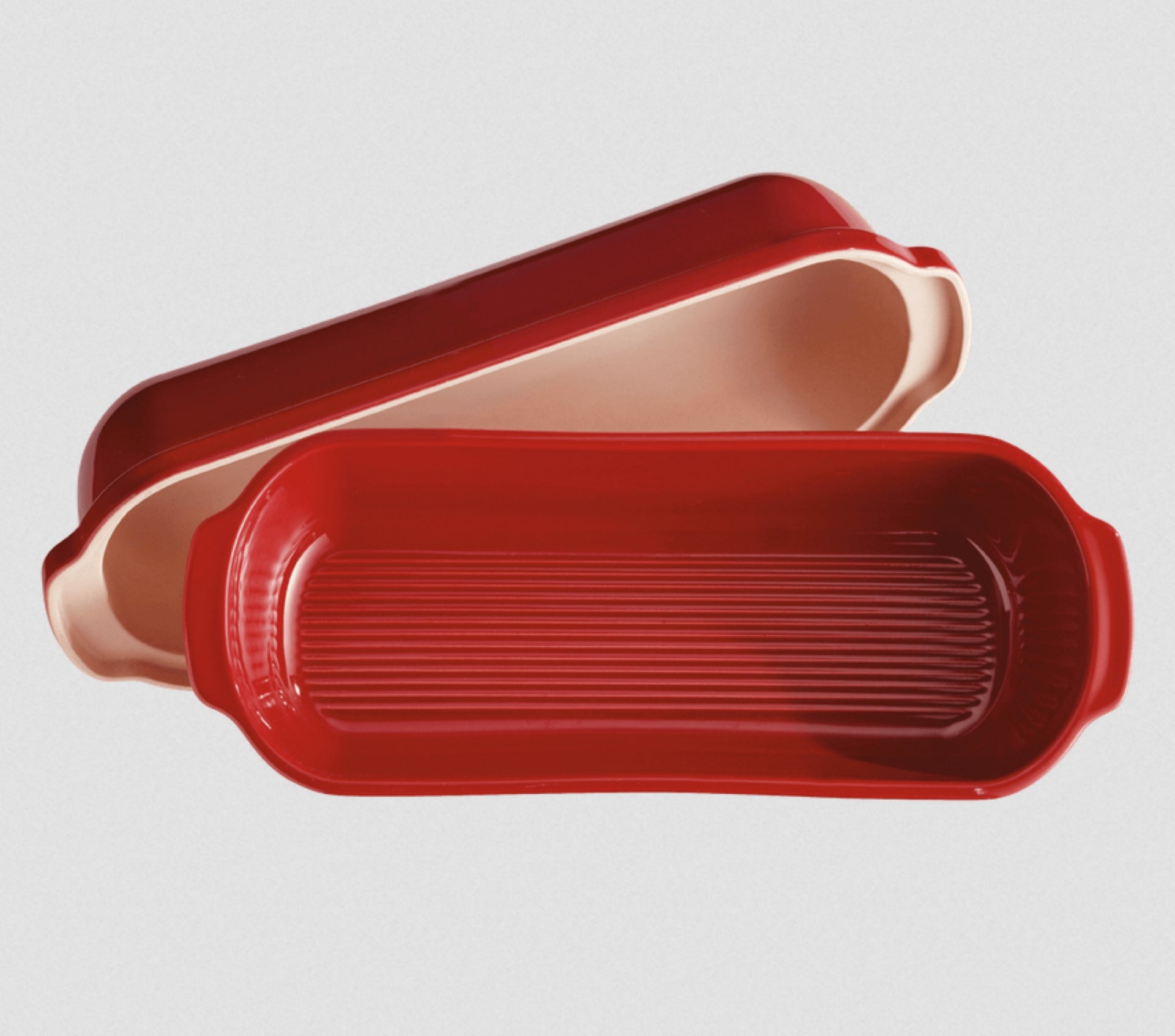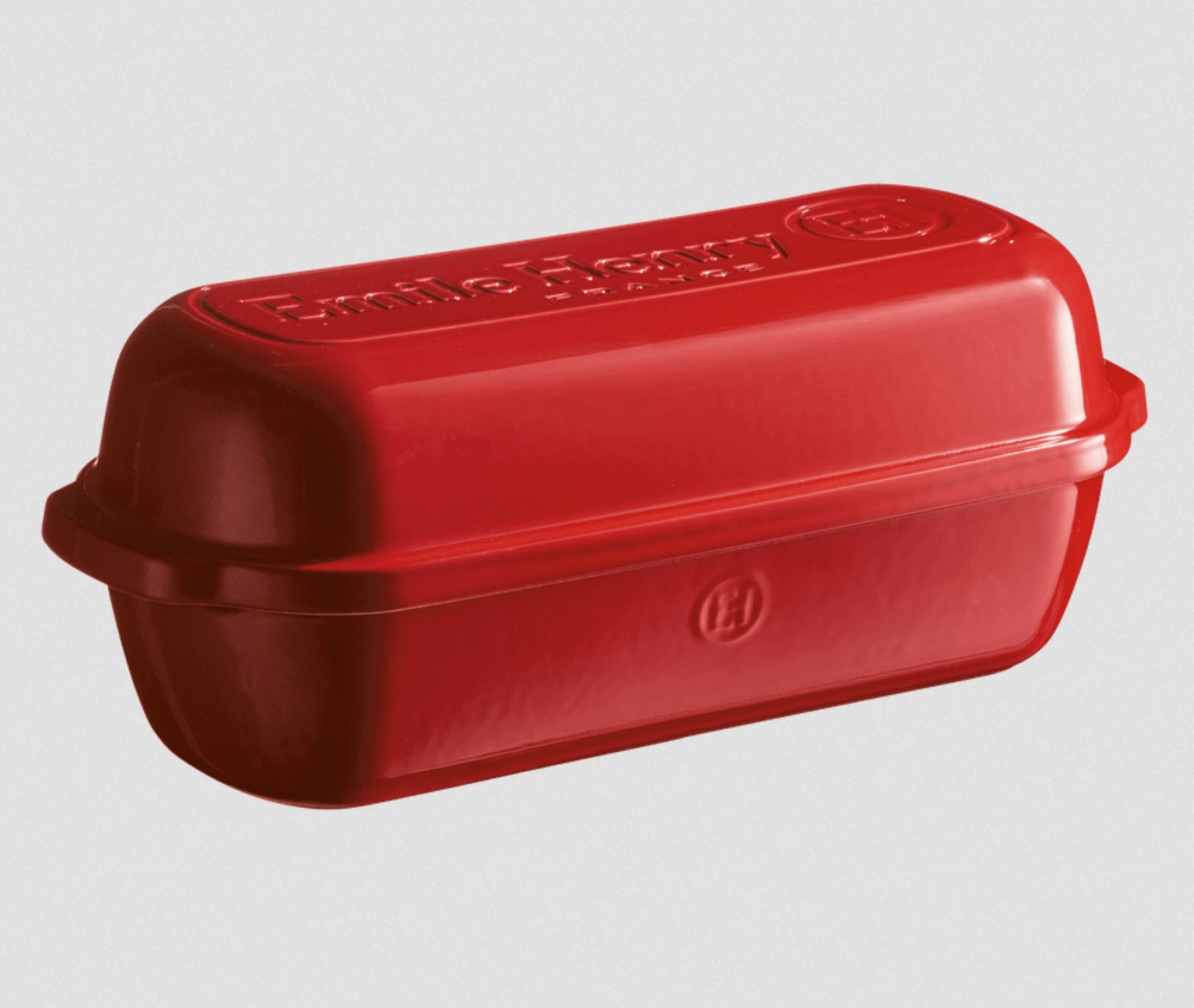 Bake artisan-style, crusty, golden loaves at home with this long covered pan. Emile Henry's specially designed covered baker helps you make bakery-worthy, artisan breads with crisp, golden crusts and chewy, airy interiors. The domed lid and ceramic walls trap steam to create a dry, crackling exterior. Handles on the lid make it easy to remove, and the ridged bottom of the pan keeps dough from sticking. The base fits neatly inside the lid for more compact storage.