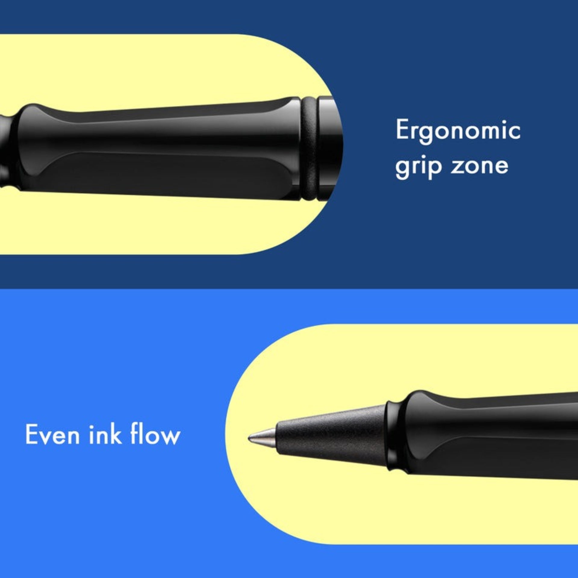 Rollerball pen for everyday use with ergonomic grip. Distinctive metal clip and resistant body made of matt ASA plastic. Including rollerball pen refill LAMY M 63 in size M in black.