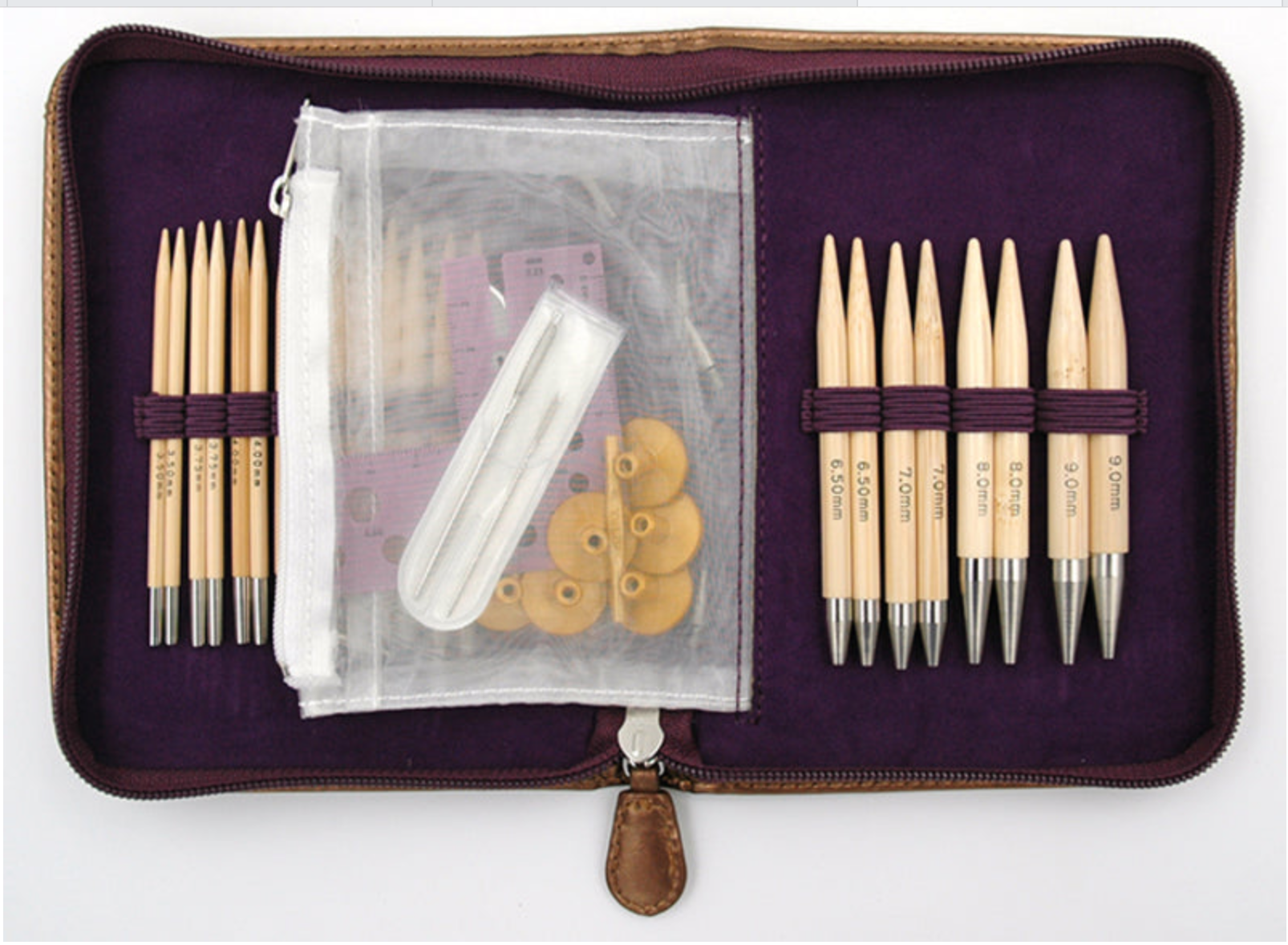 Needle: Bamboo, Nickel-plated Steel; Cable: Nylon, Nickel-plated Steel, Rubber; Adapter: Aluminum; Stopper: Aluminum; Tapestry Needle: Nickel-plated Steel; Gauge: Plastic, Stainless Steel; Case: Polyurethane, Polyester. Made in Japan.