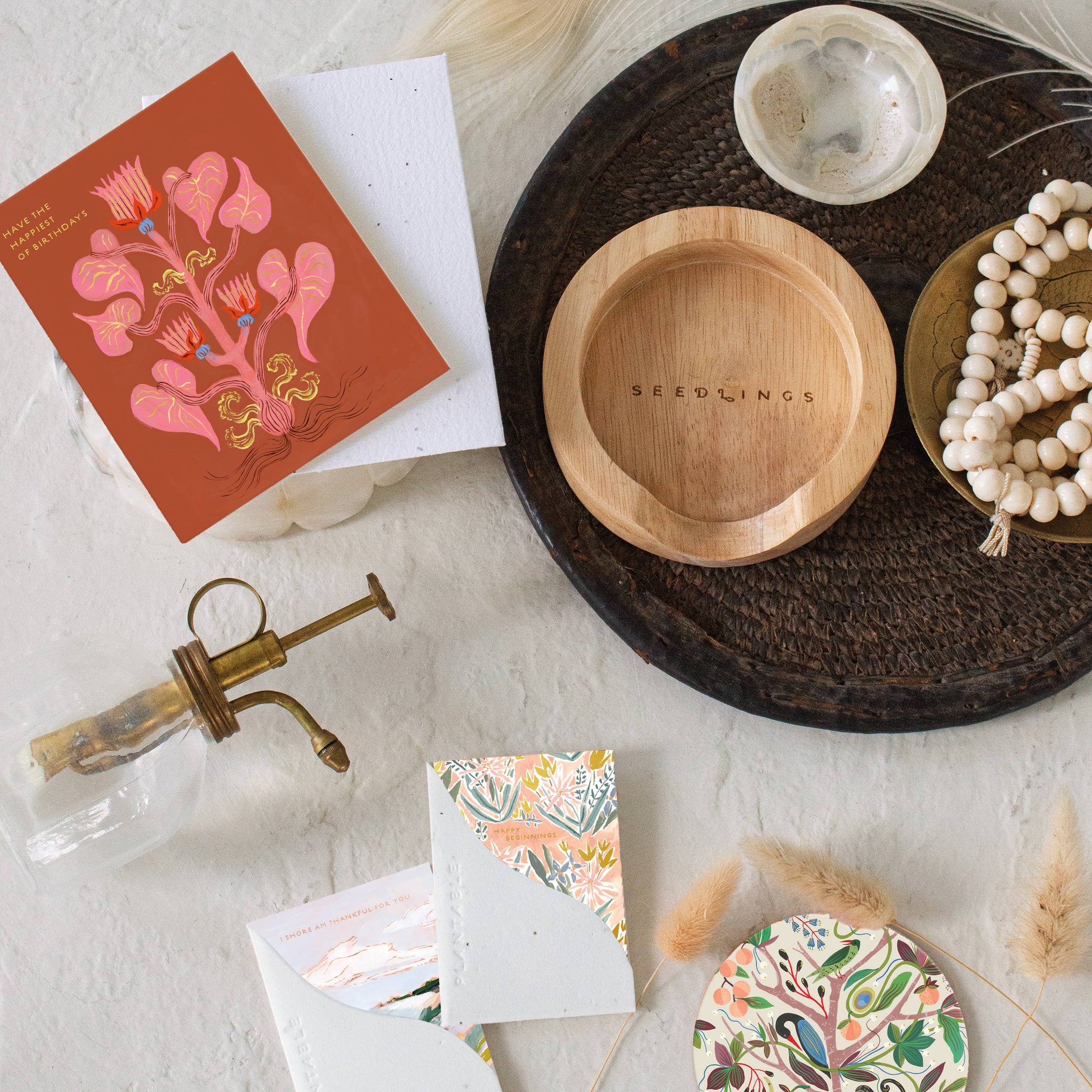 Seedlings Greeting Cards pair thoughtful design with a gift that keeps on growing. Each card features elegant foil accents and comes with a plantable seed paper envelope embedded with wildflower seeds.