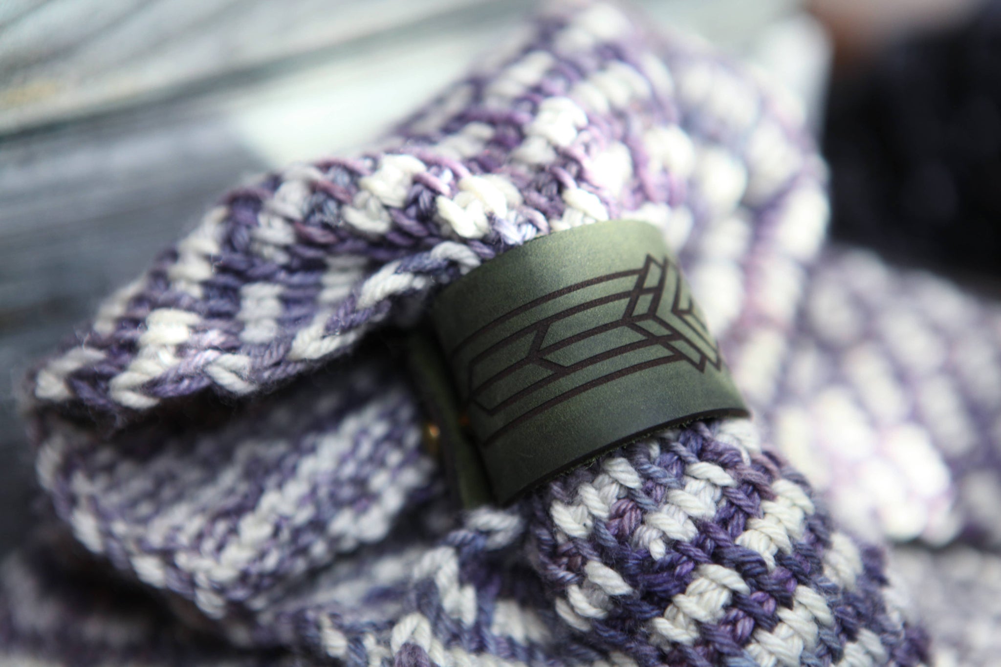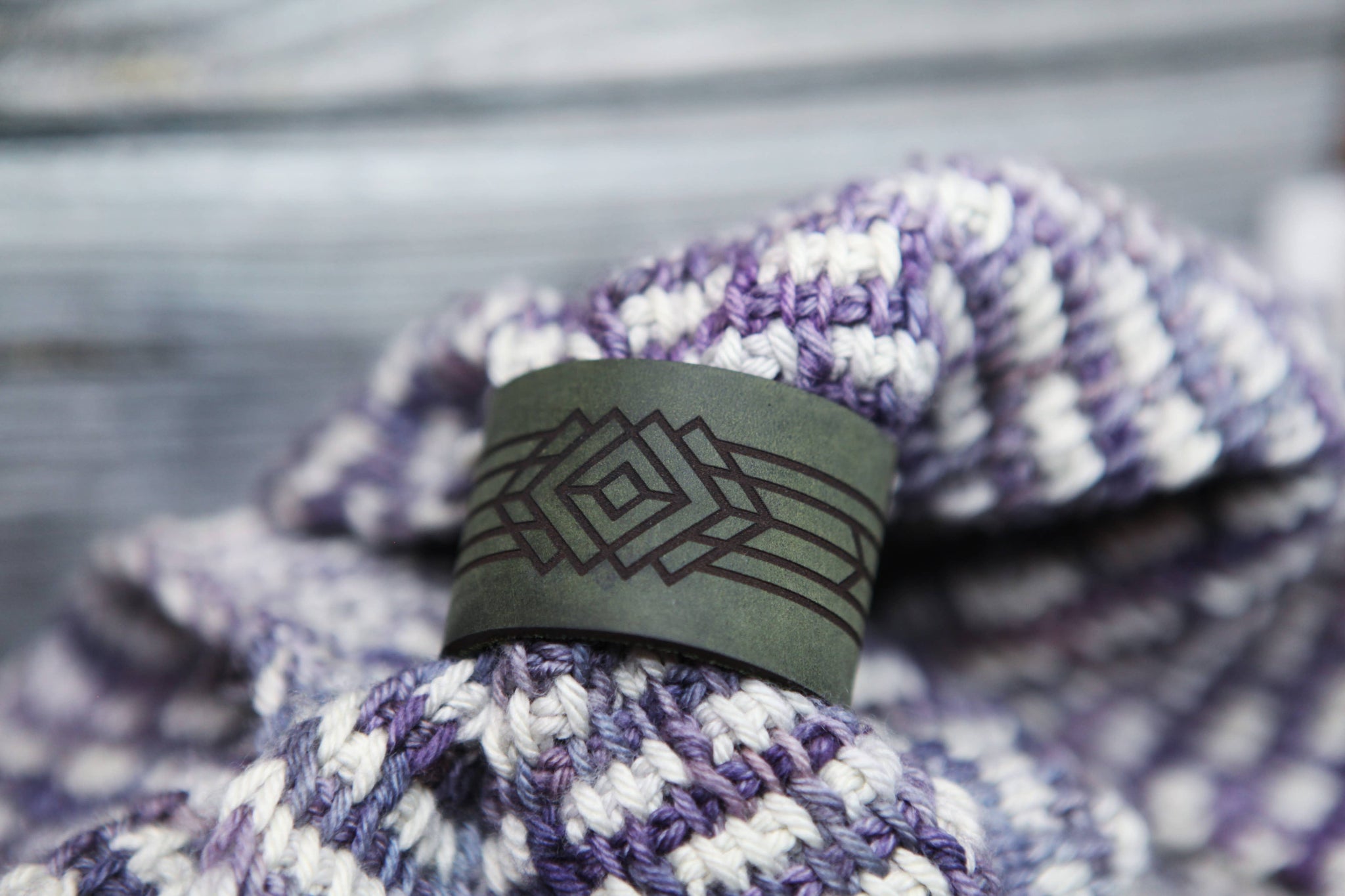 Crafted from 4–5 oz leather in a soft green tone and finished with a bronze stud, this Art Deco–inspired cuff secures your knitted or crocheted shawls, scarves, and cowls with style. Measures approximately 6" x 1.5" with a 1.5" inside diameter—ideal for lighter-weight pieces. Each cuff is one of a kind, with natural variations in the leather.